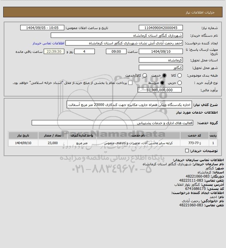 شرح کلی نیاز: اجاره یکدستگاه ویتکن همراه جاروب مکانیزه جهت کندکاری 23000 متر مربع آسفالت