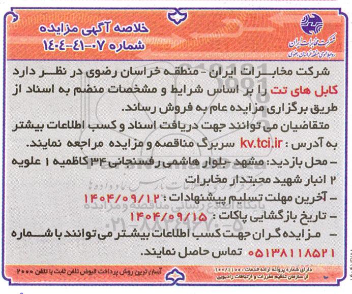 شرکت مخابرات ایران - منطقه خراسان رضوی در نظر دارد کابل های تت را براساس شرایط و مشخصات منضم به اسناد از طریق برگزاری مزایده عام به فروش رساند.