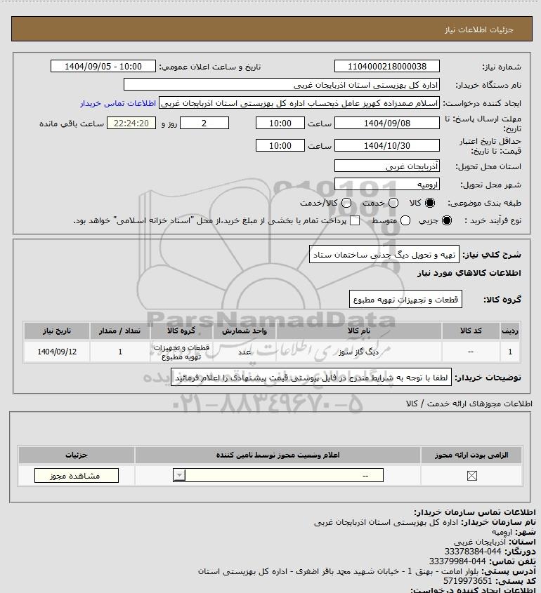 شرح کلی نیاز: تهیه و تحویل دیگ چدنی ساختمان ستاد