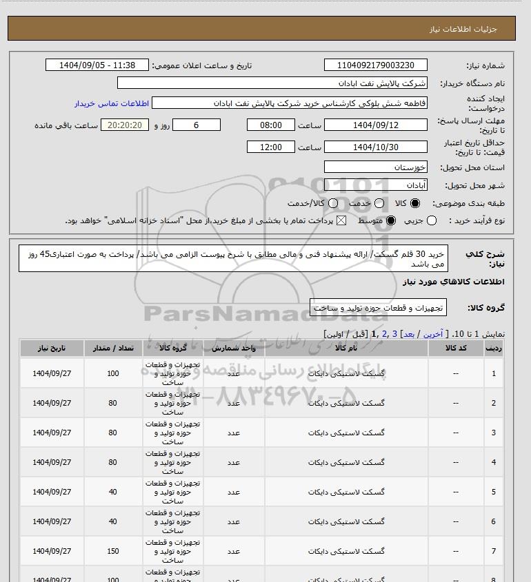 شرح کلی نیاز: خرید 30 قلم گسکت/ ارائه پیشنهاد فنی و مالی مطابق با شرح پیوست الزامی می باشد/ پرداخت به صورت اعتباری45 روز می باشد