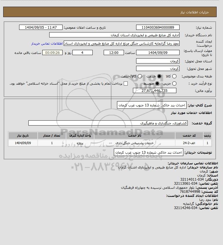 شرح کلی نیاز: احداث بند خاکی شماره 13 جنوب غرب کرمان