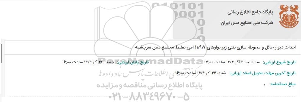 مناقصه احداث دیوار حائل و محوطه سازی بتنی زیر نوارهای 7، 9، 11 امور تغلیظ مجتمع مس سرچشمه  -مناقصه روز چهارشنبه پنجم آذر ماه 1404 از کلیه افراد متخصص و شرکت‌ها واجد شرایط دعوت به عمل می‌آید در مناقصه با کد خبرگزاری پارس نماد: 9906213 شرکت نمایند. این مناقصه در تاریخ 1404/09/05 شروع و مهلت آن تا تاریخ 1404/09/21 میباشد.