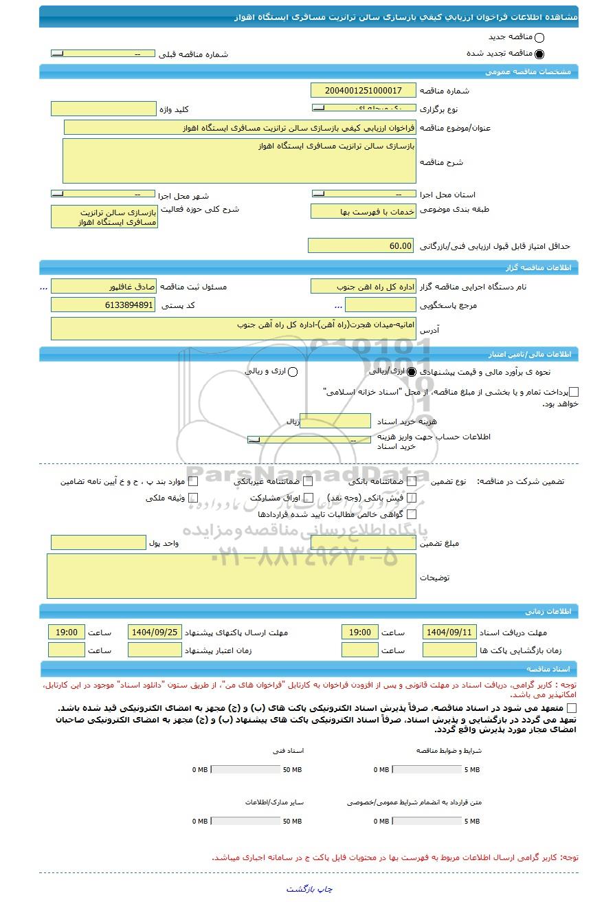 مناقصه فراخوان ارزیابی کیفی بازسازی سالن ترانزیت مسافری ایستگاه اهواز, مناقصه، فراخوان ارزیابی کیفی بازسازی سالن ترانزیت مسافری ایستگاه اهواز