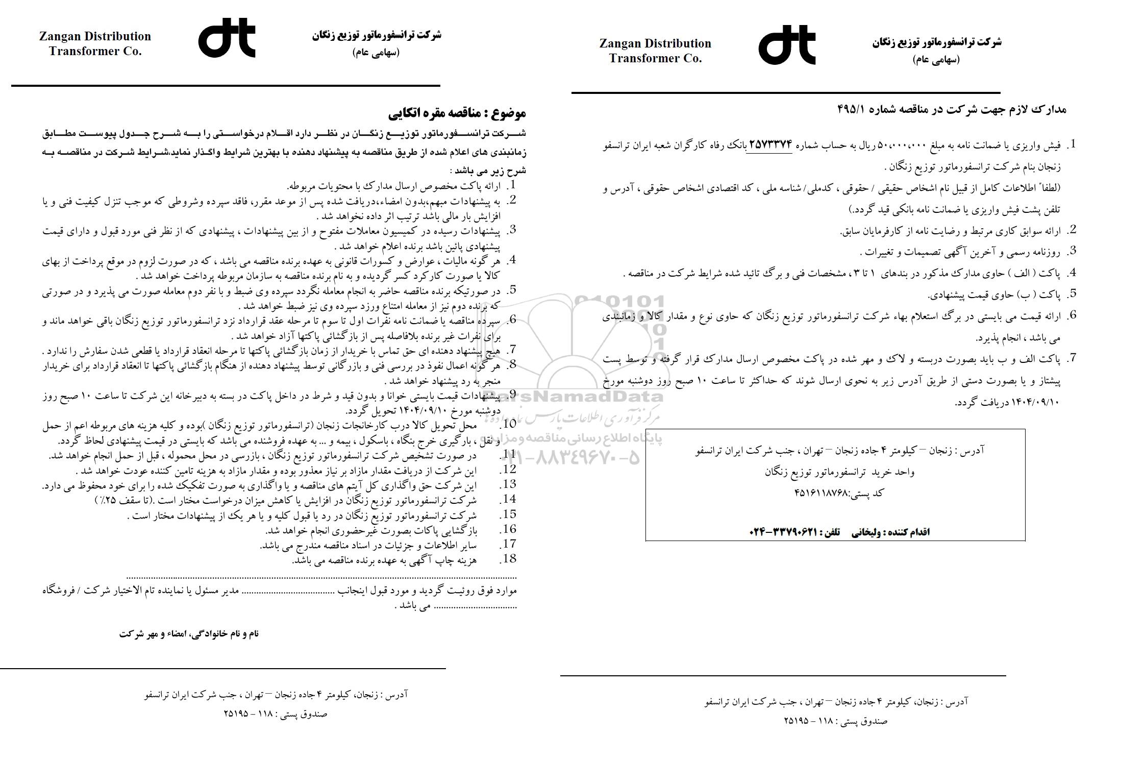 شرکت ترانسفورماتور توزیع زنگان در نظر دارد اقلام درخواستی را به شرح جدول پیوست مطابق زمانبندی های اعلام شده از طریق مناقصه به پیشنهاد دهنده با بهترین شرایط واگذار نماید شرایط شرکت در مناقصه به شرح زیر می باشد