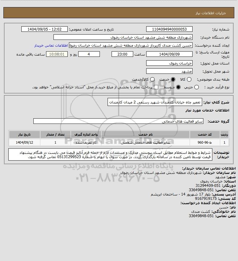 شرح کلی نیاز: تعمیر چاه خیابان کارمندان شهید رستمی 2 میدان کارمندان