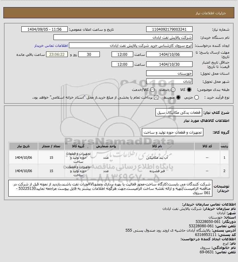 | 1 | -- | آب بند مکانیکی | عدد | تجهیزات و قطعات حوزه تولید و ساخت | 15 | 1404/10/06 |