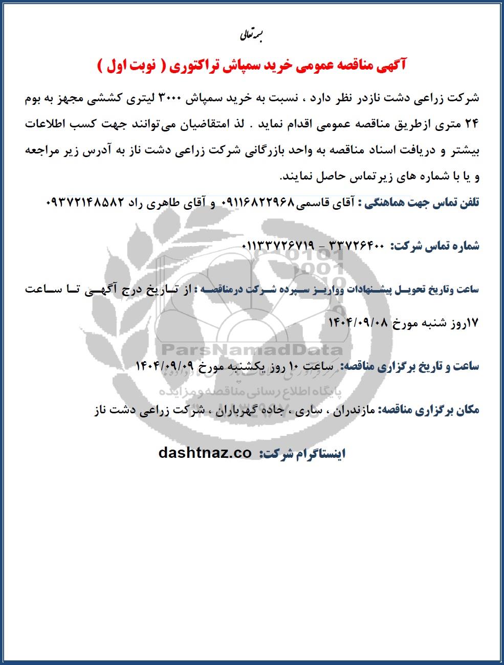 شرکت زراعی دشت ناز در نظر دارد، نسبت به خرید سمپاش 3000 لیتری کششی مجهز به بوم 24 متری از طریق مناقصه عمومی اقدام نماید. لذا متقاضیان می توانند جهت کسب اطلاعات بیشتر و دریافت اسناد مناقصه به واحد بازرگانی شرکت زراعی دشت ناز به آدرس زیر مراجعه و یا با شماره های زیر تماس حاصل نمایند.