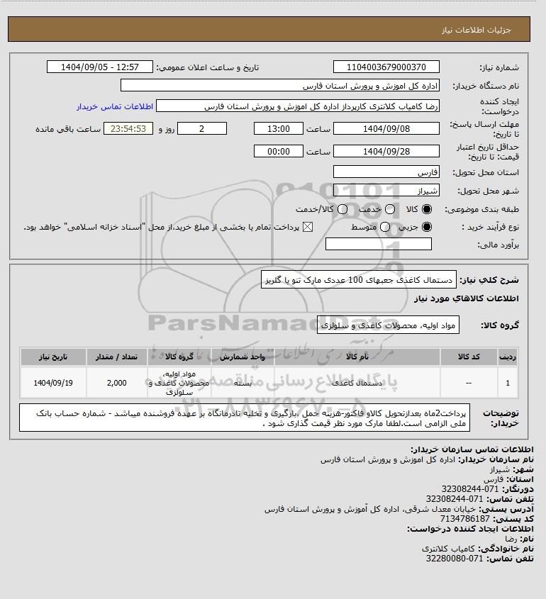 | 1 | -- | دستمال کاغذی | بسته | مواد اولیه، محصولات کاغذی و سلولزی | 2,000 | 1404/09/19 |
