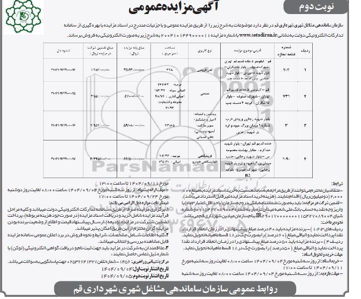 سازمان ساماندهی مشاغل شهری شهرداری قم در نظر دارد موضوعات به شرح زیر را از طریق مزایده عمومی و با جزئیات مندرج در اسناد مزایده با بهره گیری از سامانه تدارکات الکترونیکی دولت به نشانی ستاد ایران با شماره مزایده 2004101449000011 به صورت الکترونیکی به فروش برساند.