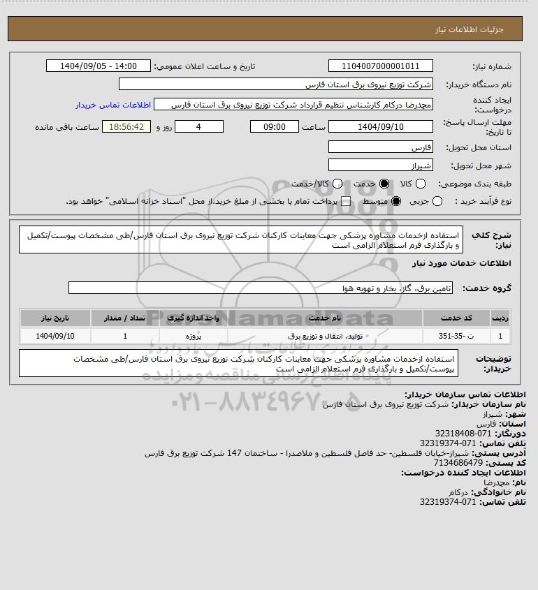 شرح کلی نیاز: استفاده ازخدمات مشاوره پزشکی جهت معاینات کارکنان شرکت توزیع نیروی برق استان فارس/طی مشخصات پیوست/تکمیل و بارگذاری فرم استعلام الزامی است