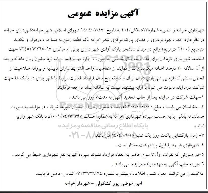 مزایده یک قطعه زمین به مساحت دو هزار و یکصد مترمربع (2100 مترمربع) جهت بهره برداری از فضای پارک مرکزی شهر خرامه -مزایده روز چهارشنبه پنجم آذر ماه 1404, مزایده یک قطعه زمین به مساحت دو هزار و یکصد مترمربع (2100 مترمربع) جهت بهره برداری از فضای پارک مرکزی شهر خرامه
