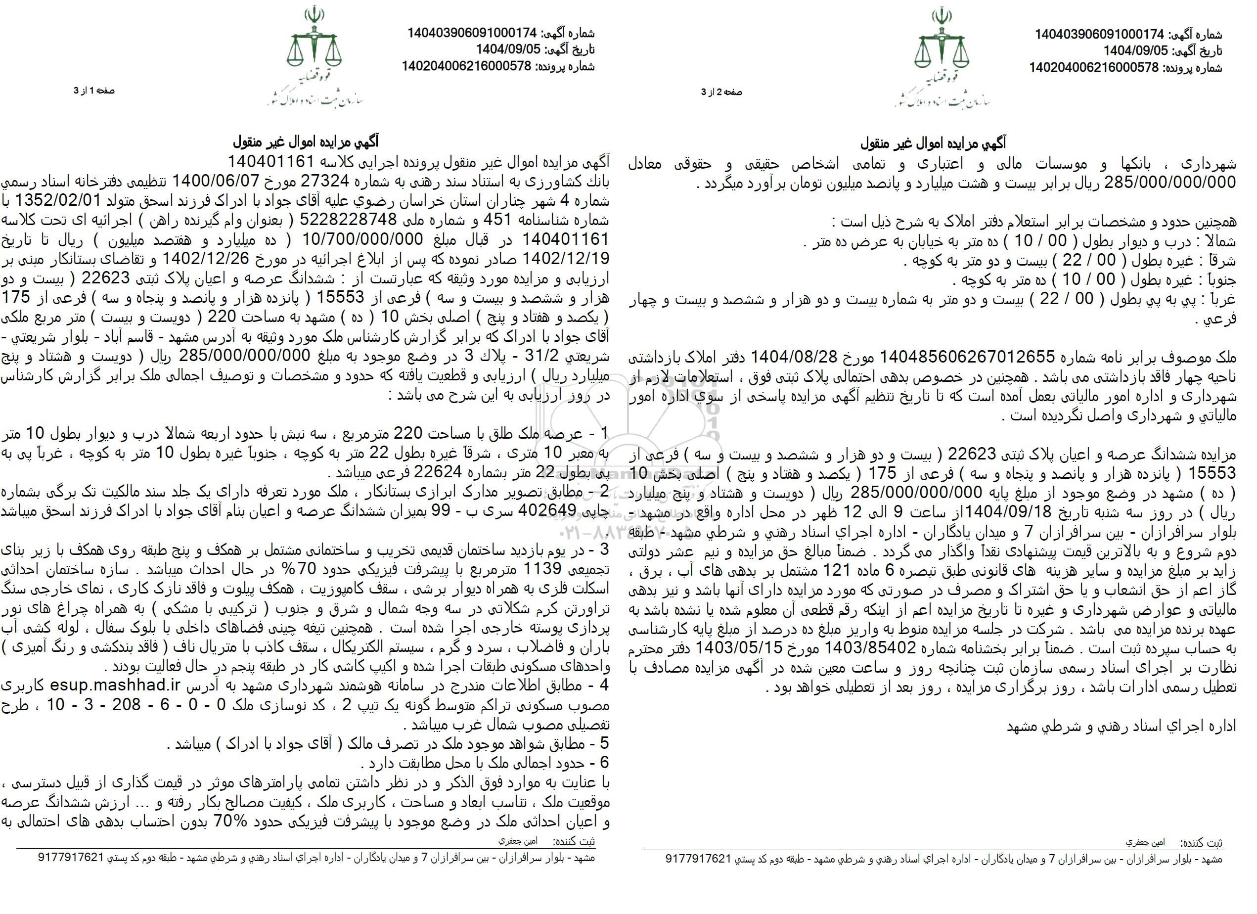 مزایده ششدانگ عرصه و اعیان پلاک ثبتی 22623 ) بیست و دو هزار و ششصد و بیست و سه ) فرعی از 15553 ) پانزده هزار و پانصد و پنجاه و سه ( فرعی از 175 ) یکصد و هفتاد و پنج ) اصلی بخش 10 ) ده ) مشهد در وضع موجود از مبلغ پایه 285.000.000.000 ریال ) دویست و هشتاد و پنج میلیارد ریال ) در روز سه شنبه تاریخ 1404.09.18 از ساعت 9 الی 12 ظهر در محل اداره واقع در مشهد -بلوار سرافرازان - بین سرافرازان 7 و میدان یادگاران - اداره اجرای اسناد رهنی و شرطی مشهد - طبقه دوم شروع و به بالاترین قیمت پیشنهادی نقداً واگذار میگردد. ضمنا مبالغ حق مزایده و نیم عشر دولتی زاید بر مبلغ مزایده و سایر هزینه های قانونی طبق تبصره 6 ماده 121 مشتمل بر بدهی های آب ، برق ، گاز اعم از حق انشعاب و یا حق اشتراک و مصرف در صورتی که مورد مزایده دارای آنها باشد و نیز بدهی مالیاتی و عوارض شهرداری و غیره تا تاریخ مزایده اعم از اینکه رقم قطعی آن معلوم شده یا نشده باشد به عهده برنده مزایده می باشد. شرکت در جلسه مزایده منوط به واریز مبلغ ده درصد از مبلغ پایه کارشناسی به حساب سپرده ثبت است. ضمنا برابر بخشنامه شماره 1403.85402 مورخ 1403.05.15 دفتر محترم نظارت بر اجرای اسناد رسمی سازمان ثبت چنانچه روز و ساعت معین شده در آگهی مزایده مصادف با تعطیل رسمی ادارات باشد، روز برگزاری مزایده ، روز بعد از تعطیلی خواهد بود .