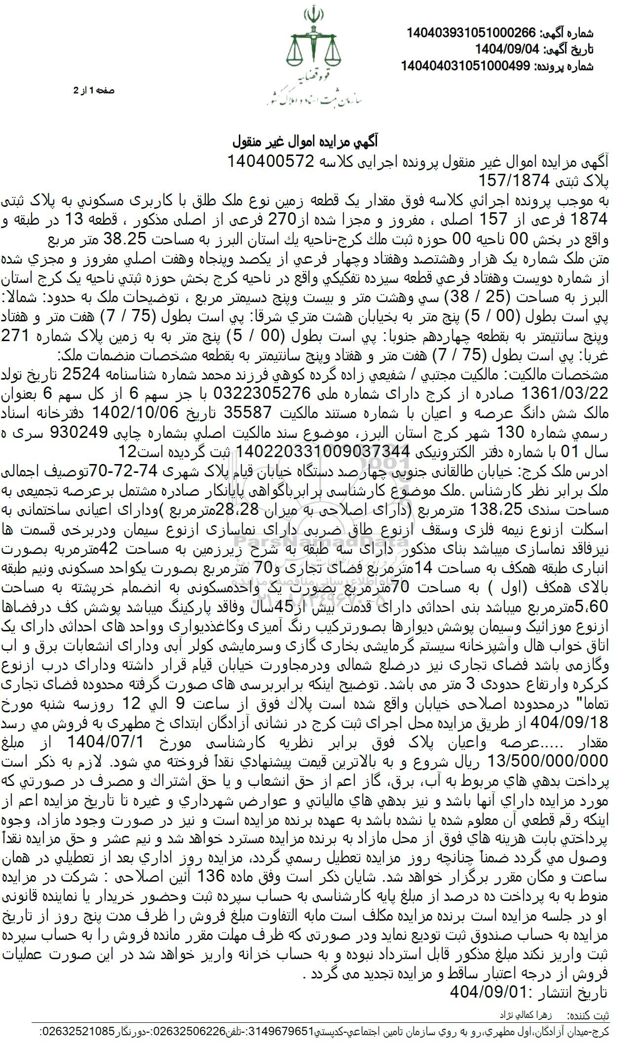 به موجب پرونده اجرائی کلاسه فوق مقدار یک قطعه زمین نوع ملک طلق با کاربری مسکونی به پلاک ثبتی 1874 فرعی از 157 اصلی، مفرور و مجرا شده از 270 فرعی از اصلی مذکور ، قطعه 13 در طبقه و واقع در بخش 00 ناحیه 00 حوزه ثبت ملک کرج - ناحیه یک استان البرز به مساحت 38.25 متر مربع