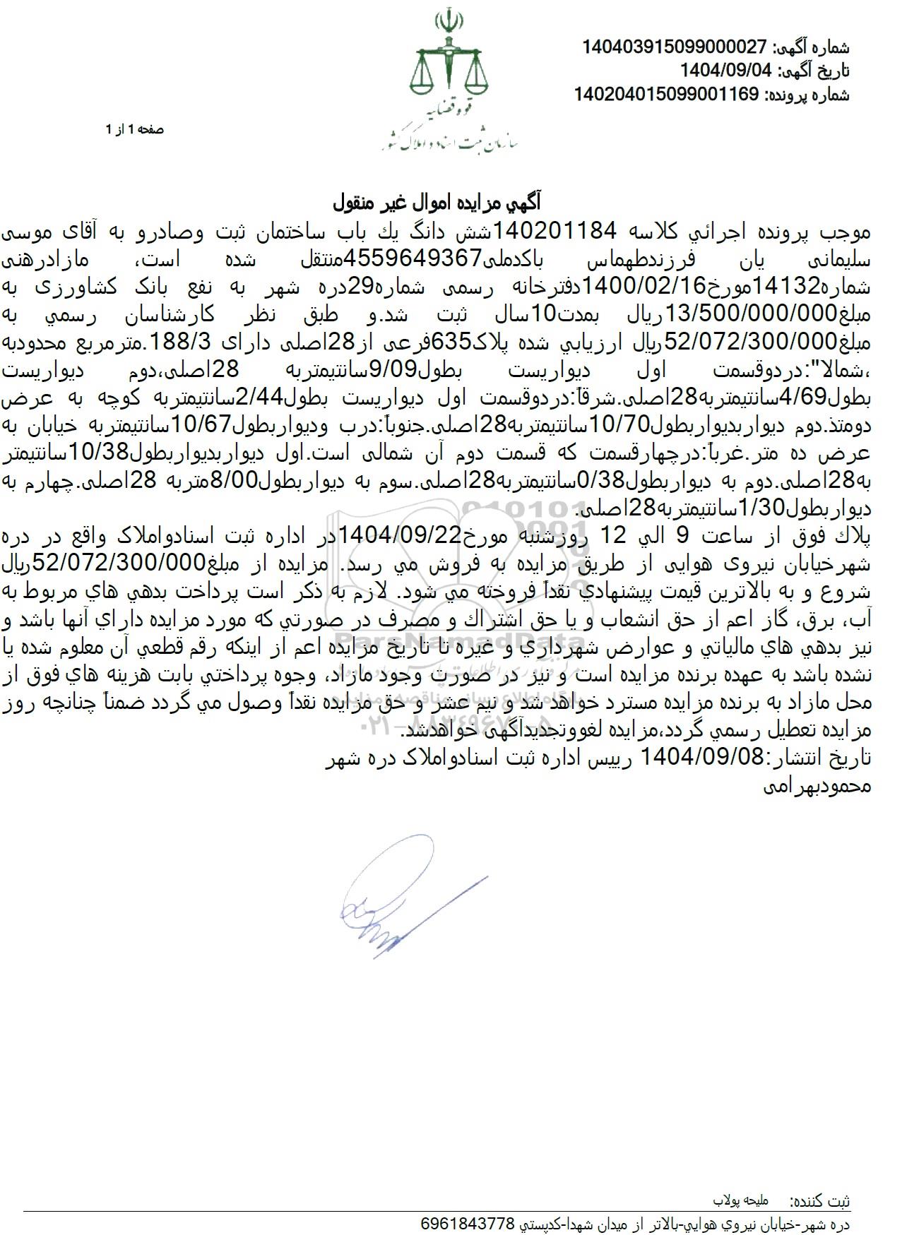 تاریخ انتشار : 1404/09/08 رئیس اداره ثبت اسناد و املاک دره شهر