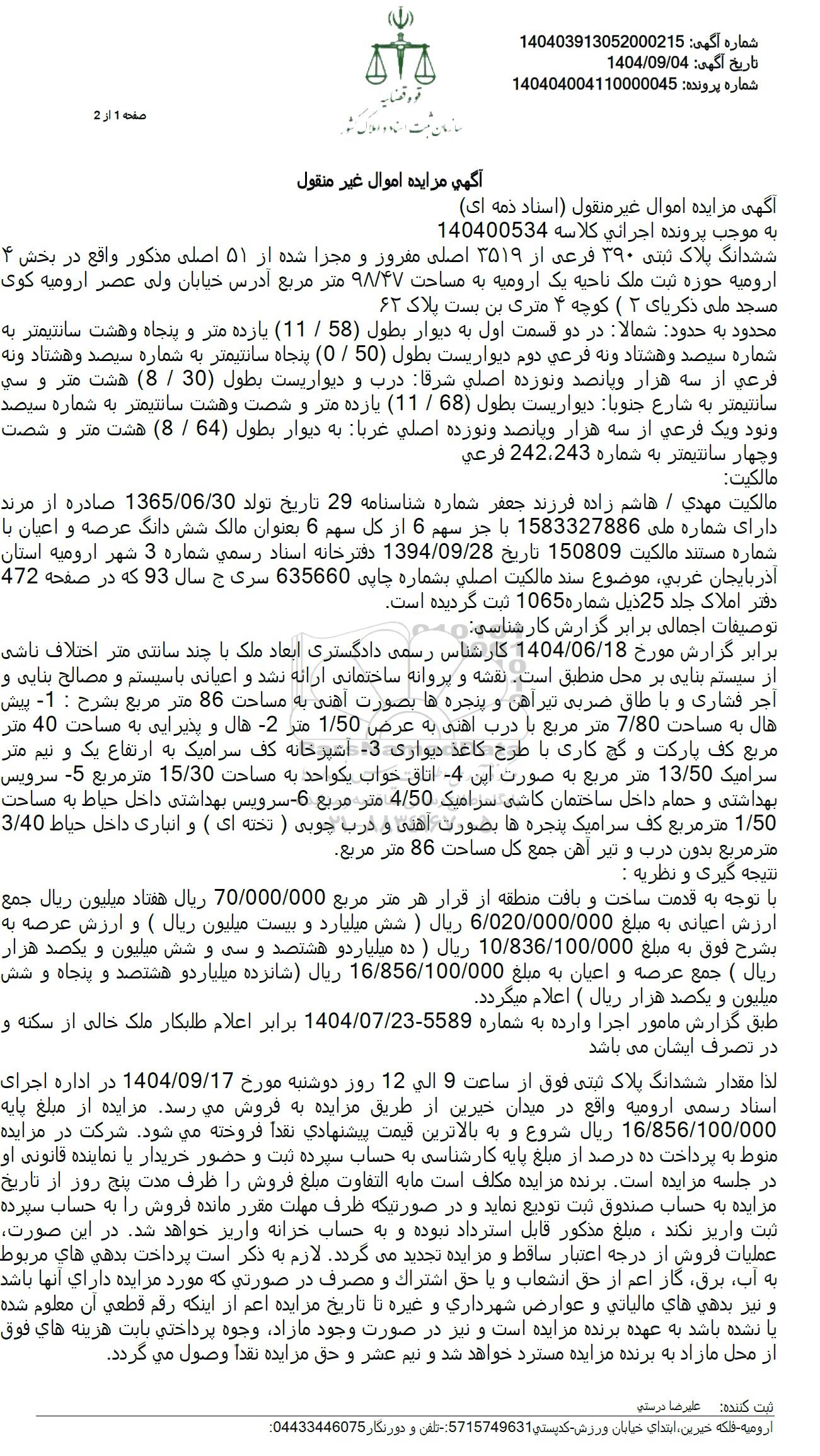 ششدانگ پلاک ثبتی 390 فرعی از 3519 اصلی مفروز و مجرا شده از 51 اصلی مذکور واقع در بخش 4 ارومیه حوزه ثبت ملک ناحیه یک ارومیه به مساحت 9.47 متر مربع آدرس خیابان ولی عصر ارومیه کوی مسجد ملی ذکریای (2) کوچه 4 متری بن بست پلاک 62