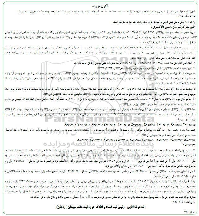 آگهی مزایده اموال غیر منقول (سند رهنی و شرطی) به موجب پرونده اجرا کلاسه 140104011181000220 این واحد اجرا متعهد خدیجه شریفی و احمد امینی - متهدله بانک کشاورزی کتبه سپیدان