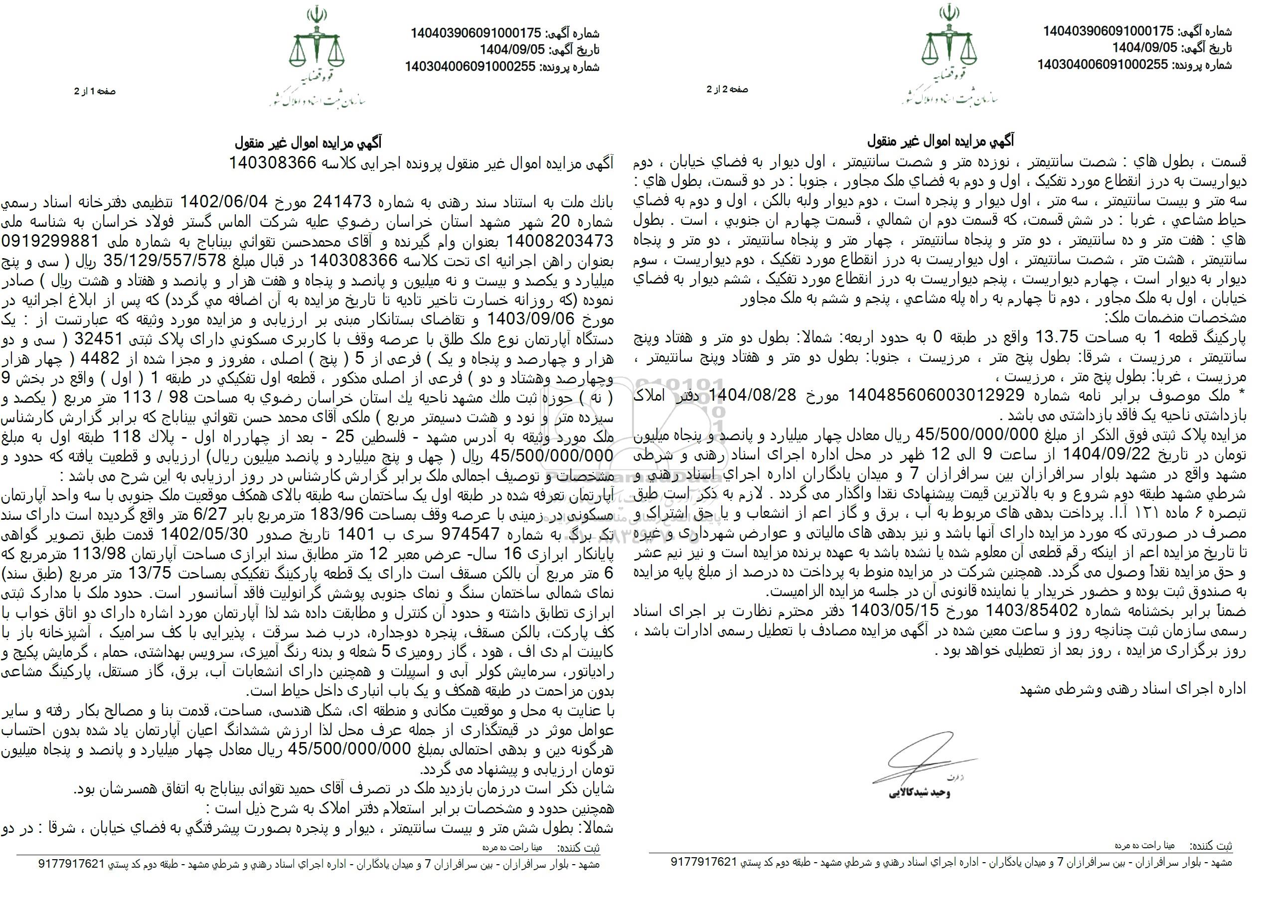 بانک ملت به استناد سند رهنی به شماره 241473 مورخ 1402.06.04 تنظیمی دفترخانه اسناد رسمی شماره 20 شهر مشهد استان خراسان رضوی علیه شرکت الماس گستر فولاد خراسان به شناسه ملی 14008203473 بعنوان وام گیرنده و آقای محمد حسن تقوائی بیناباج به شماره ملی 0919299881 بعنوان راهن اجرائیه ای تحت کلاسه 140308366 در قبال صلع 35.129.557.578 ریال ( سی و پنچ میلیارد و یکصد و بیست و نه میلیون و پانصد و پنجاه و هفت هزار و پانصد و هفتاد و هشت ریال ) صادر نموده که روزانه خسارت تاخیر تادیه تا تاریخ مزایده به آن اضافه میگردد که پس از ابلاغ اجرائیه در مورخ 1403.09.06 و تقاضای بستانکار مینی بر ارزیابی و مزایده مورد وثیقه که عبارتست از : یک دستگاه آپارتمان نوع ملک طلق با عرصه وقف با کاربری مسکونی دارای پلاک ثبتی 32451  سی و دو هزار و چهارصد و پنجاه و یک ( فرعی از 5  پنج ) اصلی، مفروز و مجرا شده از 4482  چهار هزار و چهار صد و هشتاد و دو فرعی از اصلی مذکور، قطعه اول تفکیکی در طبقه 1 ( اول ) واقع در بخش و نه ) حوزه ثبت ملک مشهد ناحیه یک استان خراسان رضوی به مساحت 98 . 113 متر مربع ( یکصد و سپرده متر و نود و هشت دسیمتر مربع ( ملکی آقای محمد حسن تقوانی بیناباج که برابر گزارش کارشناس ملک مورد وثیقه به آدرس مشهد - فلسطین 25 - بعد از چهارراه اول - یلاک 118 طبقه اول به مبلغ 45.500.000.000 ریال ) چهل و پنج میلیارد و پانصد میلیون ریال ارزیابی و قطعیت یافته که حدود و مشخصات و توصیف اجمالی ملک برابر گزارش کارشناس در روز ارزیابی به این شرح می باشد :