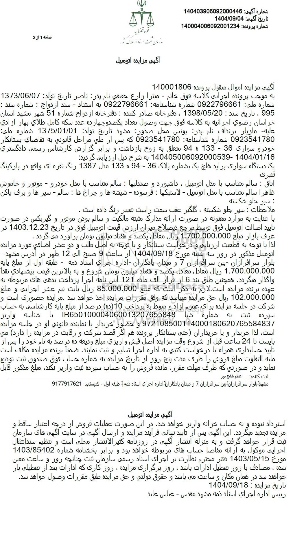 به موجب پرونده اجرایی کلاسه فوق خانم - میترا زارع حقیقی نام پدر ناصر تاریخ تولد: 1373/06/07 شماره ملی: 0922796661 شماره شناسنامه 0922796661 به استناد - سند ازدواج : شماره سند : 995 ، تاریخ سند : 1398/05/20 ، دفترخانه صادر کننده : دفترخانه ازدواج شماره 51 شهر مشهد استان خراسان رضوی اجرائیه به کلاسه فوق جهت وصول تعداد یکصد و چهارده عدد سکه کامل طلای بهار آزادی علیه مازیار برنداف نام پدر یونس محل صدور مشهد تاریخ تولد: 1375.01.01 شماره ملی: 0923541780 شماره شناسنامه 0923541780 که پس از طی مراحل قانونی به تقاضای بستانکار خودرو سواری 36 - 133 ، 94 متعلق به زوج بازداشت و برابر گزارش کارشناس رسمی دادگستری 1404.01.16-140405006092000539 به شرح ذیل ارزیابی گردید