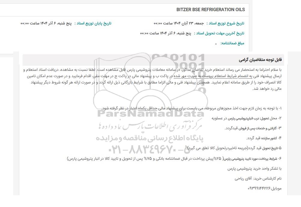 استعلام BITZER BSE REFRIGERATION OILS, استعلام BITZER BSE REFRIGERATION OILS