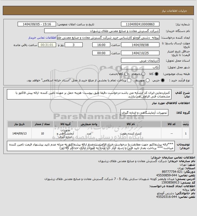 شرح کلی نیاز: کنترلردمایی-ایران کد مشابه می باشد-درخواست دقیقا طبق پیوست- هزینه حمل بر عهده تامین کننده- ارائه پیش فاکتور با مشخصات فنی الزامی می باشد