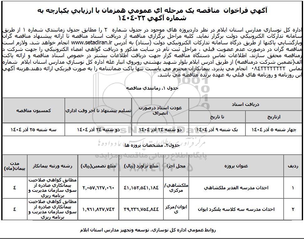اداره کل نوسازی مدارس استان ایلام در نظر دارد پروژه های موجود در جدول شماره 2 را مطابق جدول زمانبندی شماره 1 از طریق سامانه تدارکات الکترونیکی دولت برگزار نماید. کلیه مراحل برگزاری مناقصه از دریافت اسناد مناقصه تا ارائه پیشنهاد مناقصه گران و بازگشایی پاکتها از طریق درگاه سامانه تدارکات الکترونیکی دولت (ستاد) به آدرس سایت ستاد ایران انجام خواهد شد. و لازم است مناقصه گران در در صورت عدم عضویت قبلی ، مراحل ثبت نام در سایت مذکور و دریافت گواهی امضاء الکترونیکی را جهت شرکت در مناقصه محقق سازند. اطلاعات تماس دستگاه مناقصه گزار جهت دریافت اطلاعات بیشتر در خصوص اسناد مناقصه و ارائه پاکت الف (تضمین شرکت در مناقصه) از طریق آدرس ایلام بلوار شهید بهشتی روبروی انبار غله اداره کل نوسازی مدارس استان ایلام شماره تماس 08432223222 انجام می پذیرد. پیمانکاران محترم می بایست تنها پاکت ضمانتنامه را به صورت فیزیکی ارائه دهند. هزینه آگهی این روزنامه و روزنامه های قبلی به عهده برنده مناقصه می باشد