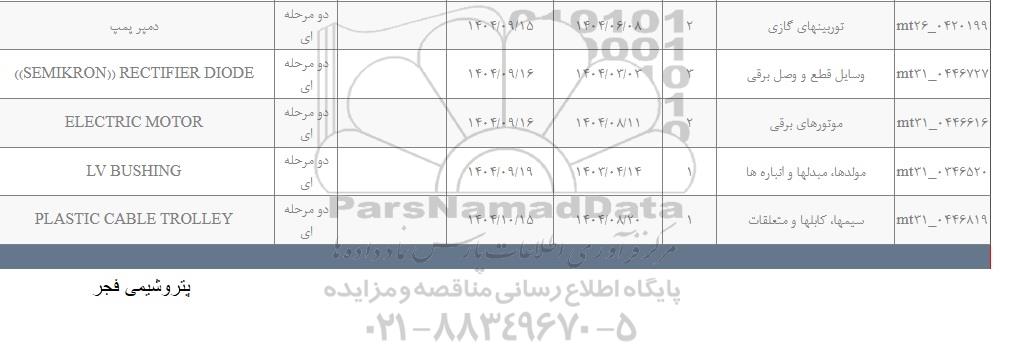مناقصات و مناقصه شیرآلات نفتی و پالایشگاهی, مناقصه و مناقصات مخازن نفتی و اسکله های نفتی, مناقصات و مناقصه نیروگاه ها, مناقصه و مناقصات گیت ولو, مناقصات و مناقصه چاه های نفتی, مناقصه و مناقصات شیرهای کنترلی پالایشگاهی, مناقصات و مناقصه لوله و اتصالات نفتی, مناقصه و مناقصات برچ تقطیر, مناقصات و مناقصه تیوب, مناقصه و مناقصات گسکت, مناقصات و مناقصه کنترل ولو, مناقصه و مناقصات ابزار دقیق, مناقصات و مناقصه کمپرسور, مناقصه و مناقصات کنتور گاز, مناقصات و مناقصه فیلترهای نفتی, مناقصه و مناقصات کندانسور, مناقصات و مناقصه رگولاتور,