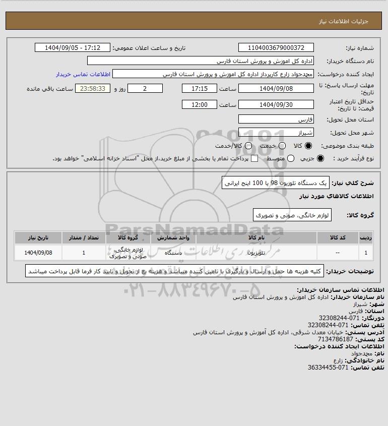 شرح کلی نیاز: یک دستگاه تلوزیون 98 یا 100 اینج ایرانی