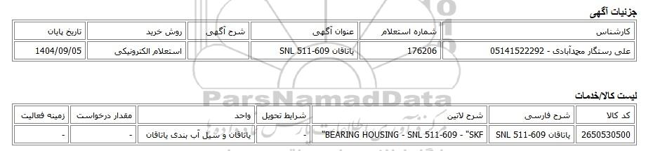 علی رستگار محمدآبادی - 05141522292176206یاتاقان SNL 511-609استعلام الکترونیکی1404/09/05