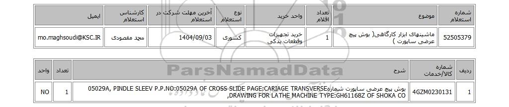 | 52505379 | ماشینهای ابزار کارگاهی( بوش پیچ عرضی ساپورت ) | 1 | خرید تجهیزات وقطعات یدکی | کشوری | 1404/09/03 | محمد مقصودی | mo.maghsoudi@KSC.IR |