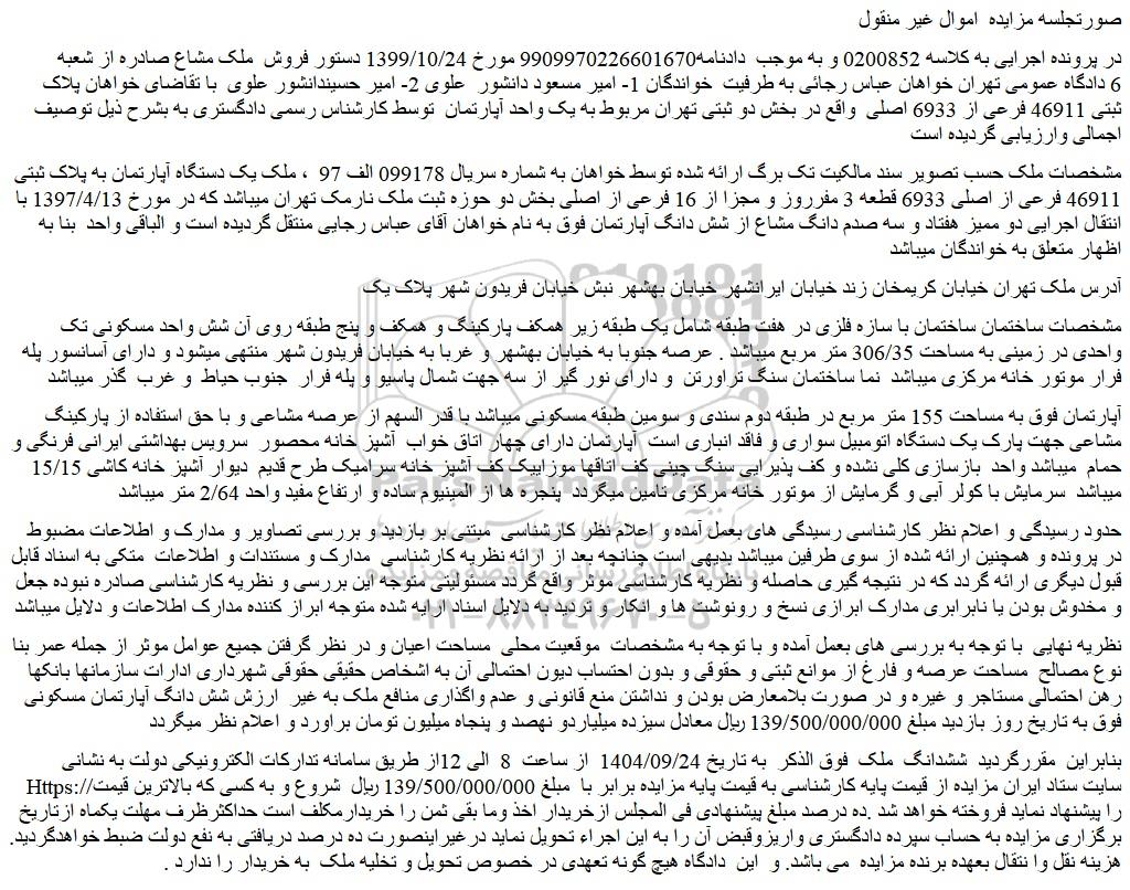 در پرونده اجرایی به کلاسه 0200852 و به موجب دادنامه9909970226601670 مورخ 1399/10/24 دستور فروش ملک مشاع صادره از شعبه 6 دادگاه عمومی تهران خواهان عباس رجائی به طرفیت خواندگان 1- امیر مسعود دانشور علوی 2- امیر حسیندانشور علوی با تقاضای خواهان پلاک ثبتی 46911 فرعی از 6933 اصلی واقع در بخش دو ثبتی تهران مربوط به یک واحد آپارتمان توسط کارشناس رسمی دادگستری به بشرح ذیل توصیف اجمالی وارزیابی گردیده است