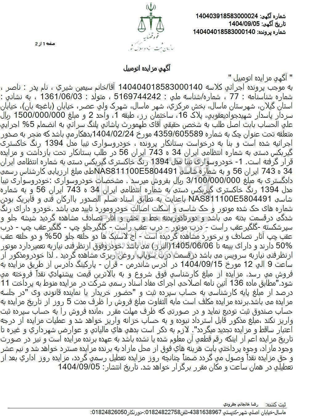 به موجب پرونده اجرائی کلاسه 140404018583000140 آقا خانم سیمین شیری ، نام پدر : ناصر ، شماره شناسنامه : 77 ، شماره شناسه ملی : 5169744242 ، متولد : 1361.06.03 ، به نشانی : استان گیلان شهرستان ماسال بخش مرکزی شهر ماسال شهرک ولی عصر خیابان باغچه بان، خیابان سردار پاسدار شهید جواد یعقوبی، پلاک 16 ساختمان رز طبقه 1 واحد 2 و مبلغ 1500.000.000 ریال علی الحساب بابت اصل طلب به شخص حقیقی آقای طهمورث پاشانی پلنگ سرانی به انضمام 5% اجرایی متعلقه تحت عنوان چک به شماره 4359.605589 مورخ 1404.02.24 بدهکار می باشد که منجر به صدور اجرائیه شده است و بنا به درخواست بستانکار پرونده، خودرو سواری تیبا مدل 1394 رنگ خاکستری گیربکس دستی به شماره انتظامی ایران 034 743 ایران 56 در طلب بستانکار تحت بازداشت و مزایده قرار گرفته است. 1- خودرو سواری تیبا مدل 1394 رنگ خاکستری گیربکس دستی به شماره انتظامی ایران 34 0 743 ایران 56 و به شماره شاسی NAS8111005804491 طی مبلغ ارزیابی کارشناس رسمی دادگستری به مبلغ 3.100.000.000 ریال بفروش میرسد . مشخصات خودروسواری خودروسواری تیبا مدل 1394 رنگ خاکستری گیربکس دستی به شماره انتظامی ایران 034 743 ایران 56 و به شماره شاسی NAS8111005804491 با عنایت به تطابق اسناد مسلم الصدور با ارکان فنی و فابریک بودن شماره های حک شده موتور و حک شاسی و اسکلت اصالت خودرو مورد تایید میباشد. خودرو دارای رنگ شدگی در قسمت بدنه میباشد و دور تا دور بدنه خط و خش و آثار تصادف مشاهده گردید شیشه جلو و سپر شکسته - گلگیر عقب راست - درب موتور - درب عقب راست - گلگیر جلو چپ - گلگیر عقب چپ - درب عقب چپ آثار تصادف و برخورد مشاهده گردیده است - آج لاستیک ها دو حلقه جلو 50% و دو حلقه عقب %50 دارند و دارای بیمه تا 1405.06.06 (البرز) می باشد . خودرو فوق از نظر فنی نیاز به تعمیر دارد موتور از نظر فنی نیاز به سرویس میباشد در قسمت درب سوپاپ روغن ریزی مشاهده گردید . لذا خودرو مذکور از ساعت 9 الی 12 مورخ 1404.09.15 در آدرس شاندرمن - قرآن - پارکینگ دادرس از طریق مزایده به فروش میرسد مزایده از مبلغ کارشناسی فوق شروع و به بالاترین قیمت پیشنهادی نقداً فروخته می شود. مطابق ماده 136 آئین نامه اصلاحی اجرای مفاد اسناد رسمی شرکت در مزایده منوط به پرداخت 11 درصد از مبلغ پایه کارشناسی به حساب سپرده ثبت و حضور خریدار یا نماینده قانونی وی در جلسه مزایده می باشد. برنده مزایده مکلف است مابه التفاوت مبلغ فروش را ظرف مدت 5 روز از تاریخ مزایده به حساب صندوق ثبت تودیع نماید و در صورتی که ظرف مهلت مقرر مانده فروش را به حساب سپرده ثبت واریز نکند ، مبلغ مذکور قابل استرداد نبوده و به حساب خزانه واریز خواهد شد و عملیات مزایده از درجه اعتبار ساقط و مزایده تجدید میگردد. لازم به ذکر است بدهی های مالیاتی و عوارض شهرداری و غیره تا تاریخ مزایده اعم از اینکه رقم قطعی آن معلوم شده یا نشده باشد به عهده برنده مزایده است و نیز در صورت وجود مازاد وجوه پرداختی بابت هزینه های فوق از محل مازاد به برنده مزایده مسترد خواهد شد و نیم عشر و حق مزایده نقداً وصول میگردد ضمنا چنانچه روز مزایده تعطیل رسمی گردد مزایده روز اداری بعد از تعطیلی در همان ساعت و مکان مقرر برگزار خواهد شد.
