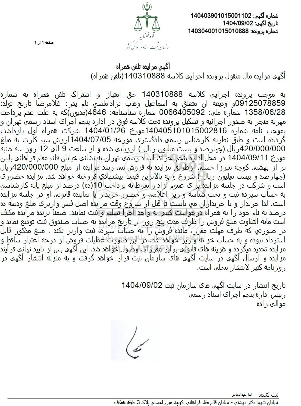 به موجب پرونده اجرایی کلاسه 140310888 حق امتیاز و اشتراک تلفن همراه به شماره 09125078859 و ودیعه آن متعلق به اسماعیل و هاب نژاد املشی نام پدر غلامرضا تاریخ تولد: 1358.06.28 شماره ملی: 0066405092 شماره شناسنامه 4646 مدیون که به علت عدم پرداخت مهریه منجر به صدور اجرائیه و تشکیل پرونده تحت کلاسه فوق در اداره پنجم اجرای اسناد رسمی تهران و بموجب نامه شماره 140405101015002816 مورخ 1404.01.26 شرکت همراه اول بازداشت گردیده است و طبق نظریه کارشناس رسمی دادگستری مورخه 1404.07.05 ارزش سیم کارت به مبلغ 420.000.000 ریال چهارصد و بیست میلیون ریال ( ارزیابی شده و از ساعت 9 الی 12 روز سه شنبه مورخ 1404.09.11 در محل اداره پنجم اجرای اسناد رسمی تهران به نشانی خیابان قائم مقام فراهانی پایین تر از بهشتی کوچه میرزا حسنی از طریق مزایده به فروش میرسد مزایده از مبلغ 420.000.000 ریال چهار صد و بیست میلیون ریال ( شروع و به بالاترین قیمت پیشنهادی فروخته خواهد شد. مزایده حضوری است و شرکت در جلسه مزایده برای عموم آزاد و منوط به پرداخت (10 (ده) درصد از مبلغ پایه کارشناسی به حساب سپرده ثبت و تحت شناسه واریز اعلامی و حضور خریدار یا نماینده قانونی او در جلسه مزایده است. لذا خریدار و یا خریداران می بایست تا قبل از شروع وقت مزایده اصل فیش واریزی مبلغ ودیعه ده درصد به نام خود را به همراه درخواست کتبی به واحد اجرا تسلیم و ثبت نمایند. ضمناً برنده مزایده مکلف است ما به التفاوت مبلغ فروش را ظرف مدت پنج روز از تاریخ مزایده به حساب صندوق ثبت تودیع نماید و در صورتی که ظرف مهلت مقرر مانده فروش را به حساب سپرده ثبت واریز نکند ، مبلغ مذکور قابل استرداد نبوده و به حساب خزانه واریز خواهد شد. در این صورت عملیات فروش از درجه اعتبار ساقط و مزایده تجدید میگردد و هزینه های قانونی برابر مقررات وصول خواهد شد. این اگهی پس از تایید نهایی فرآیند مزایده و ارسال آگهی در سایت آگهی های سازمان ثبت قرار خواهد گرفت و به منزله انتشار آگهی در روزنامه کثیر الانتشار محلی است.