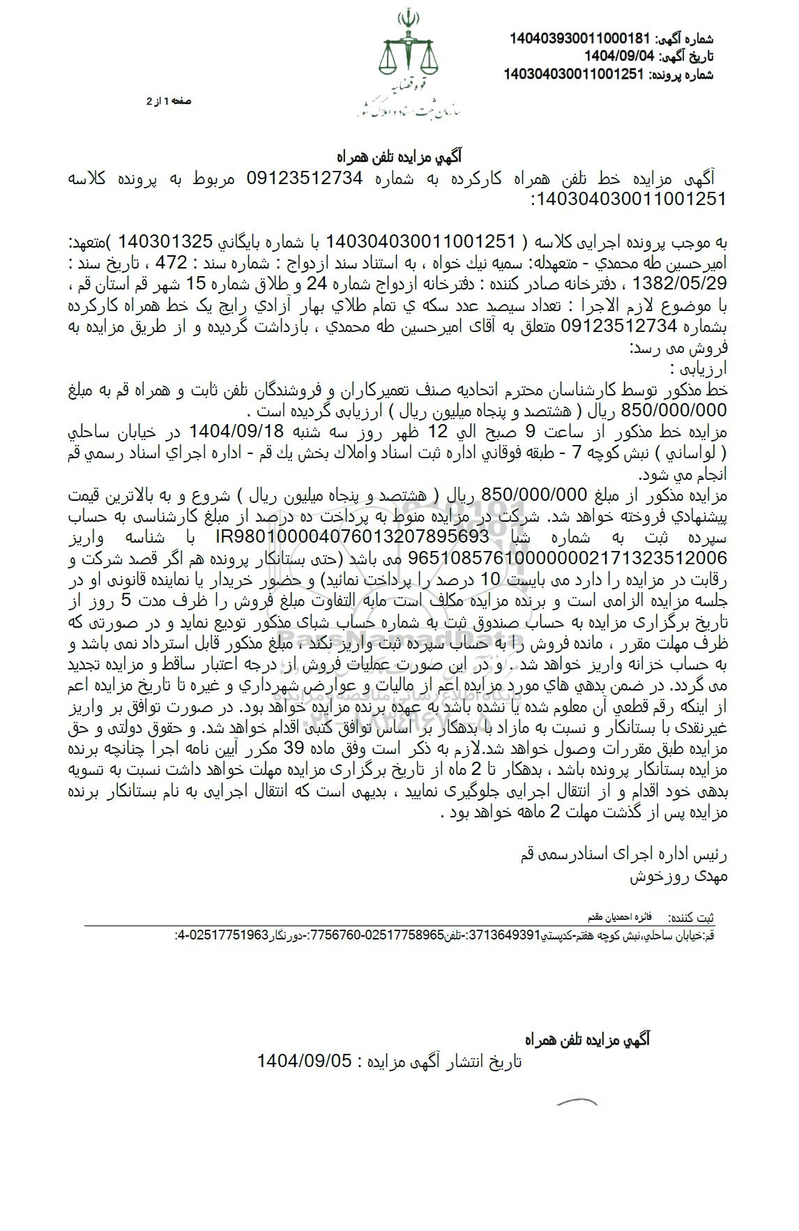 امیر حسین طه محمدی - متعهدله سمیه نیک خواه، به استناد سند ازدواج : شماره سند : 472 ، تاریخ سند : 1382.05.29 ، دفترخانه صادر کننده : دفترخانه ازدواج شماره 24 و طلاق شماره 15 شهر قم استان قم ، با موضوع لازم الاجرا : تعداد سیصد عدد سکه ی تمام طلای بهار آزادی رایج یک خط همراه کار کرده بشماره 09123512734 متعلق به آقای امیر حسین طه محمدی، بازداشت گردیده و از طریق مزایده به
