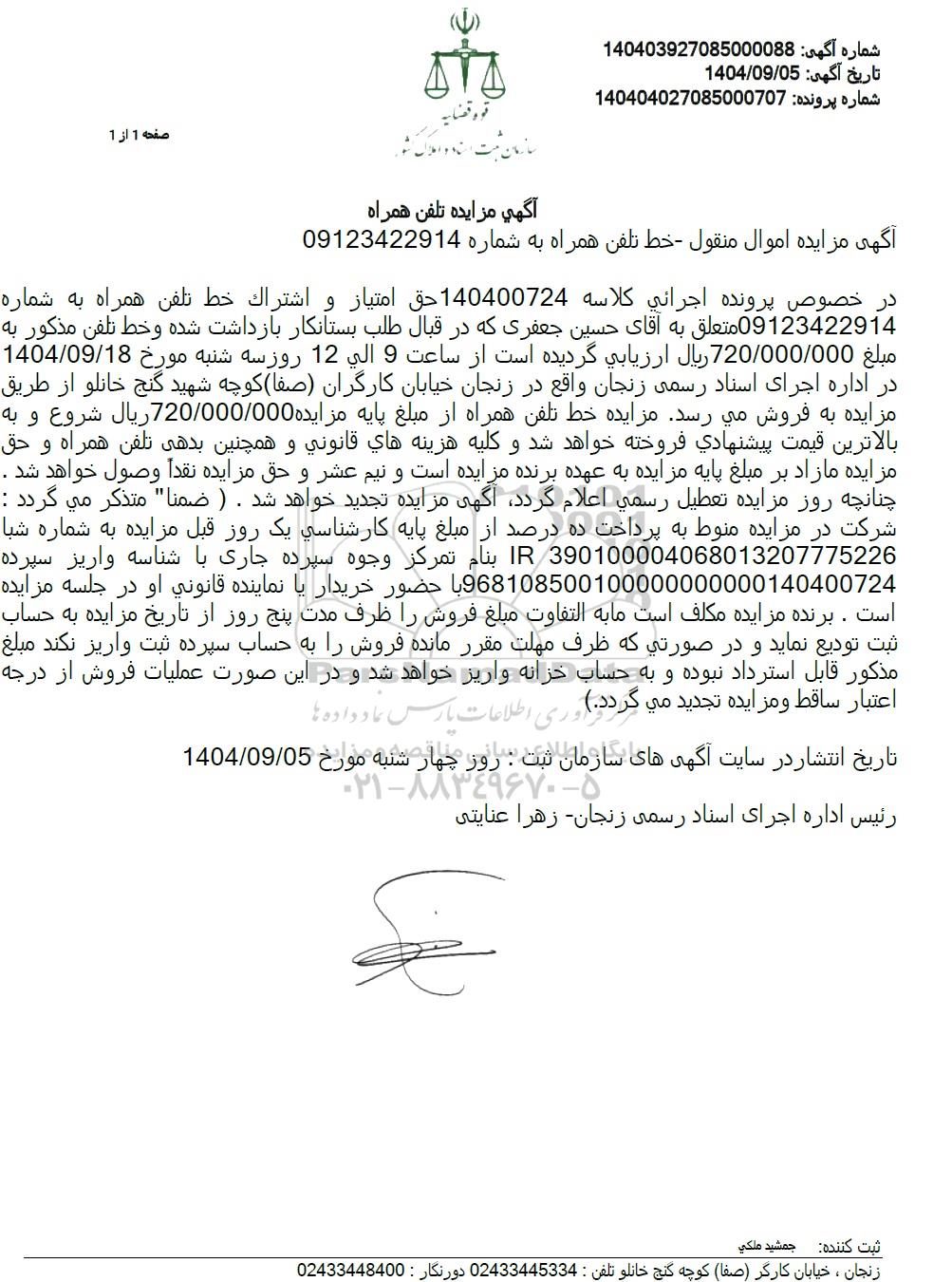 آگهی مزایده اموال منقول خط تلفن همراه به شماره 09123422914