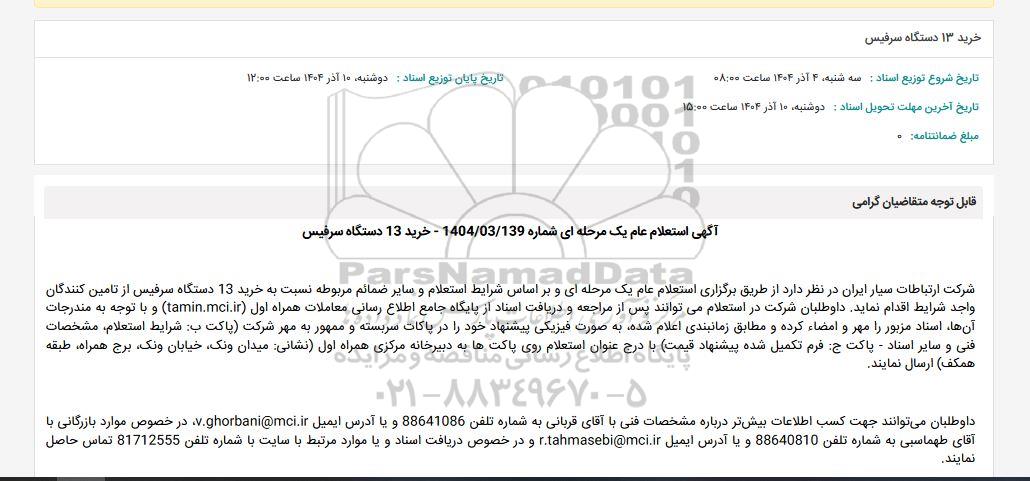 شرکت ارتباطات سیار ایران در نظر دارد از طریق برگزاری استعلام عام یک مرحله ای و بر اساس شرایط استعلام و سایر ضمائم مربوطه نسبت به خرید 13 دستگاه سرفیس از تامین کنندگان واجد شرایط اقدام نماید. داوطلبان شرکت در استعلام می توانند پس از مراجعه و دریافت اسناد از پایگاه جامع اطلاع رسانی معاملات همراه اول (tamin.mci.ir) و با توجه به مندرجات آنها، اسناد مزبور را مهر و امضاء کرده و مطابق زمانبندی اعلام شده، به صورت فیزیکی پیشنهاد خود را در پاکات سربسته و ممهور به مهر شرکت (پاکت ب: شرایط استعلام، مشخصات فنی و سایر اسناد - پاکت ج: فرم تکمیل شده پیشنهاد قیمت) با درج عنوان استعلام روی پاکت ها به دبیرخانه مرکزی همراه اول (نشانی: میدان ونک، خیابان ونک، برج همراه، طبقه همکف) ارسال نمایند.