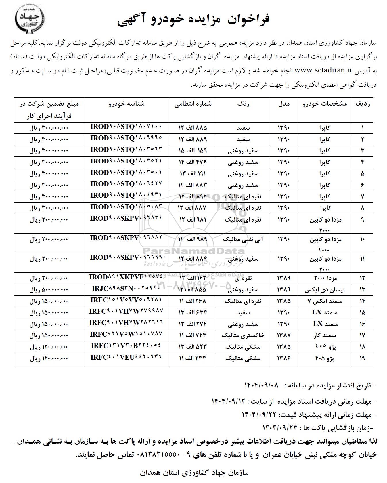 مزایده عمومی مزایده خودرو برگزار میگردد. از کلیه افراد متخصص و شرکتهای واجد شرایط دعوت به عمل میآید تا در این مزایده با کد خبرگزاری پارس نماد : 9910178 شرکت نمایند تاریخ شروع مزایده : 1404/09/08 مهلت شرکت در مزایده: تا پایان روز 1404/09/12 مکان برگزاری اموال واگذاری استانهای مزایدات استان همدان و دستهبندیهای مربوط به این حراجی انواع خودرو سبک میباشد.