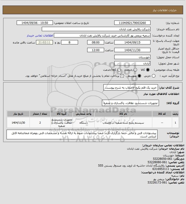 | 1 | -- | سیستم پکیج شده تصفیه آب فاضلاب | دستگاه | تجهیزات شستشو، نظافت، پاکسازی و تصفیه | 2 | 1404/11/30 |