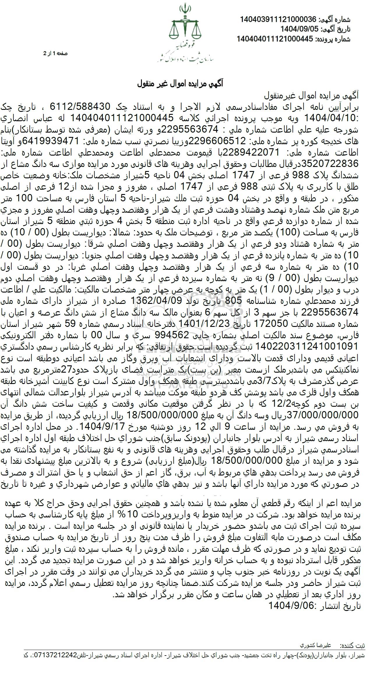 مزایده موازی سه دانگ مشاع از ششدانگ پلاک 988 فرعی از 1747 اصلی بخش 04 ناحیه 5 شیراز مشخصات ملک خانه وضعیت خاص طلق با کاربری به پلاک ثبتی 988 فرعی از 1747 اصلی، مفرور و مجزا شده از 12 فرعی از اصلی مذکور، در طبقه و واقع در بخش 04 حوزه ثبت ملک شیراز - ناحیه 5 استان فارس به مساحت 100 متر مربع متن ملک شماره نهصد و هشتاد و هشت فرعی از یک هزار و هفتصد وجهل و هفت اصلی مغرور و مجری شده از شماره دوازده فرعی واقع در ناحیه اداره ثبت منطقه 5 بخش 4 حوزه ثبتي منطقه 5 شیراز استان فارس به مساحت 100) یکصد متر مربع ، توضیحات ملک به حدود شمالا دیواریست بطول (00 / 10) ده متر به شماره هشتاد و دو فرعی از یک هزار و هفتصد و چهل و هفت اصلي شرقا ديواريست بطول 00 /(10) ده متر به شماره پانزده فرعی از یک هزار و هفتصد و جهل و هفت اصلي جنوبا ديواريست بطول 00 /(10) ده متر به شماره سه فرعی از یک هزار و هفتصد و چهل و هفت اصلي غربا در دو قسمت اول دیواریست بطول (00 / 9 نه متر به شماره سیزده فرعی از یک هزار و هفتصد و جهل و هفت اصلي دوم درب و دیوار بطول (00 / (1) یک متر به کوچه به عرض چهار متر مشخصات مالکیت مالكيت علي / اطاعت فرزند محمد علي شماره شناسنامه 805 تاریخ تولد 1362/04/09 صادره از شیراز دارای شماره ملی 2295563674 با جر سهم 3 از کل سهم 6 بعنوان مالک سه دانگ مشاع از شش دانگ