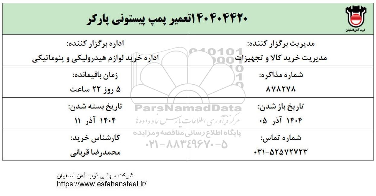 استعلام بها و موضوع استعلام استعلام تعمیر پمپ پیستونی پارکر به اطلاع کلیه شرکتها و افراد متخصص واجد شرایط میرساند، آگهی گذار در نظر دارد از طریق استعلام بها، نسبت به انتخاب و دریافت پیشنهادات اقدام نماید. این استعلام با کد آگهی ثبت شده در سامانه خبرگزاری پارس نماد : 9910219 منتشر شده است. مشخصات استعلام : تاریخ شروع استعلام: 1404/09/06 آخرین مهلت ارسال پیشنهاد قیمت : 1404/09/11 و محل اجرای پروژه : استان مناقصات استان اصفهان میباشد. استعلام قیمت مورد درخواست : استعلام تعمیر پمپ پیستونی پارکر با دستهبندیهای تخصصی و گروه های مرتبط : خدمات صنعتی, الکتروموتور و پمپ های شناور, ساخت،نصب و تعمیرات صنایع فولاد, تجهیزات و ماشین آلات صنعتی, استعلام اطلاع رسانی میگردد.