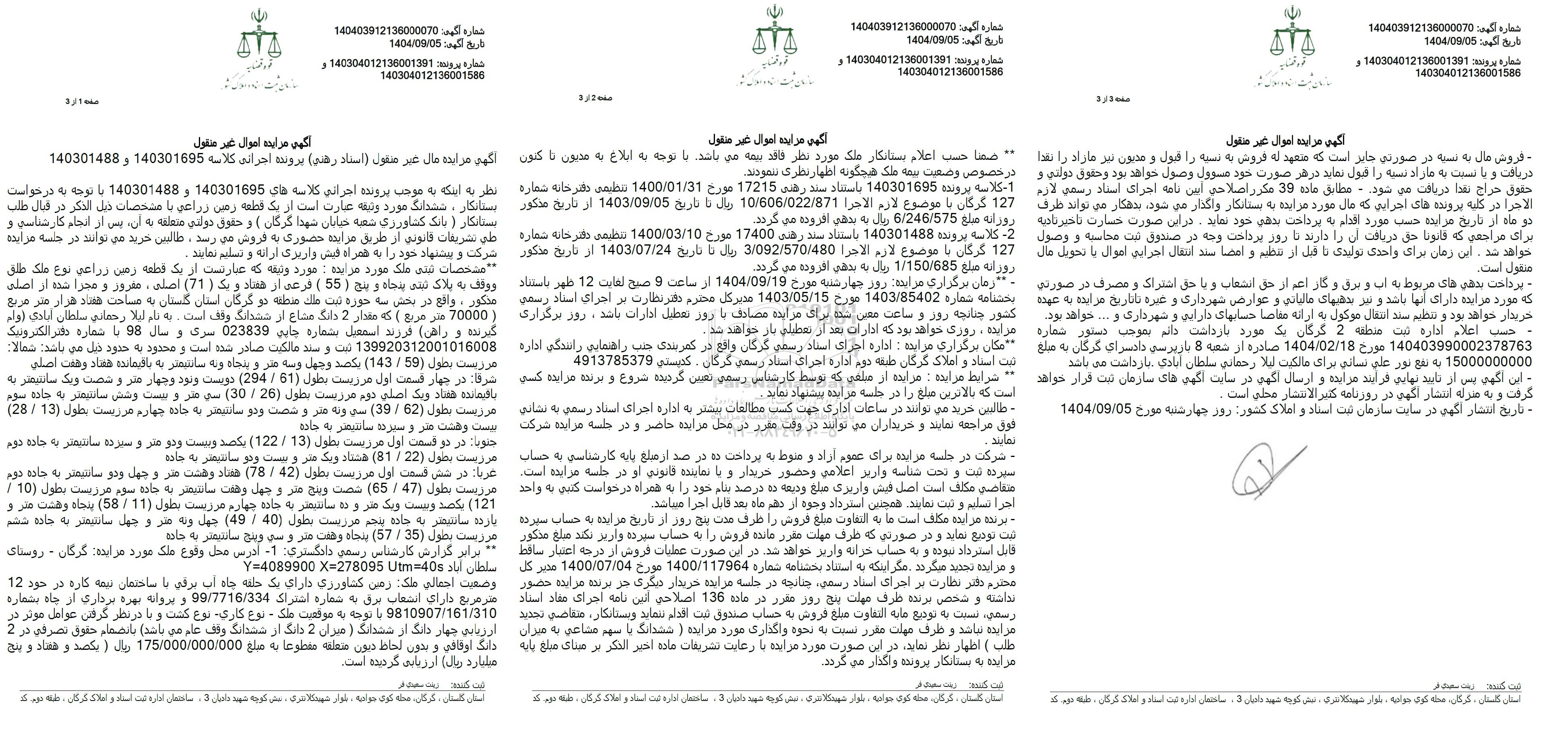 آگهی مزایده مال غیر منقول (اسناد رهنی) پرونده اجرایی کلاسه 140301695 و 140301488