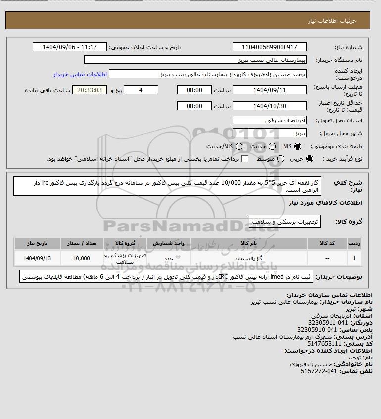| 1 | -- | گاز پانسمان | عدد | تجهیزات پزشکی و سلامت | 10,000 | 1404/09/13 |