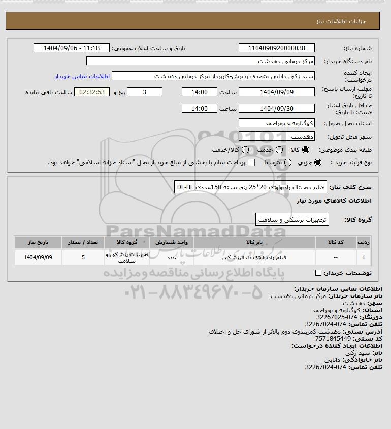 شرح کلی نیاز: فیلم دیجیتال رادیولوژی 20*25 پنج بسته 150عددی DL-HL