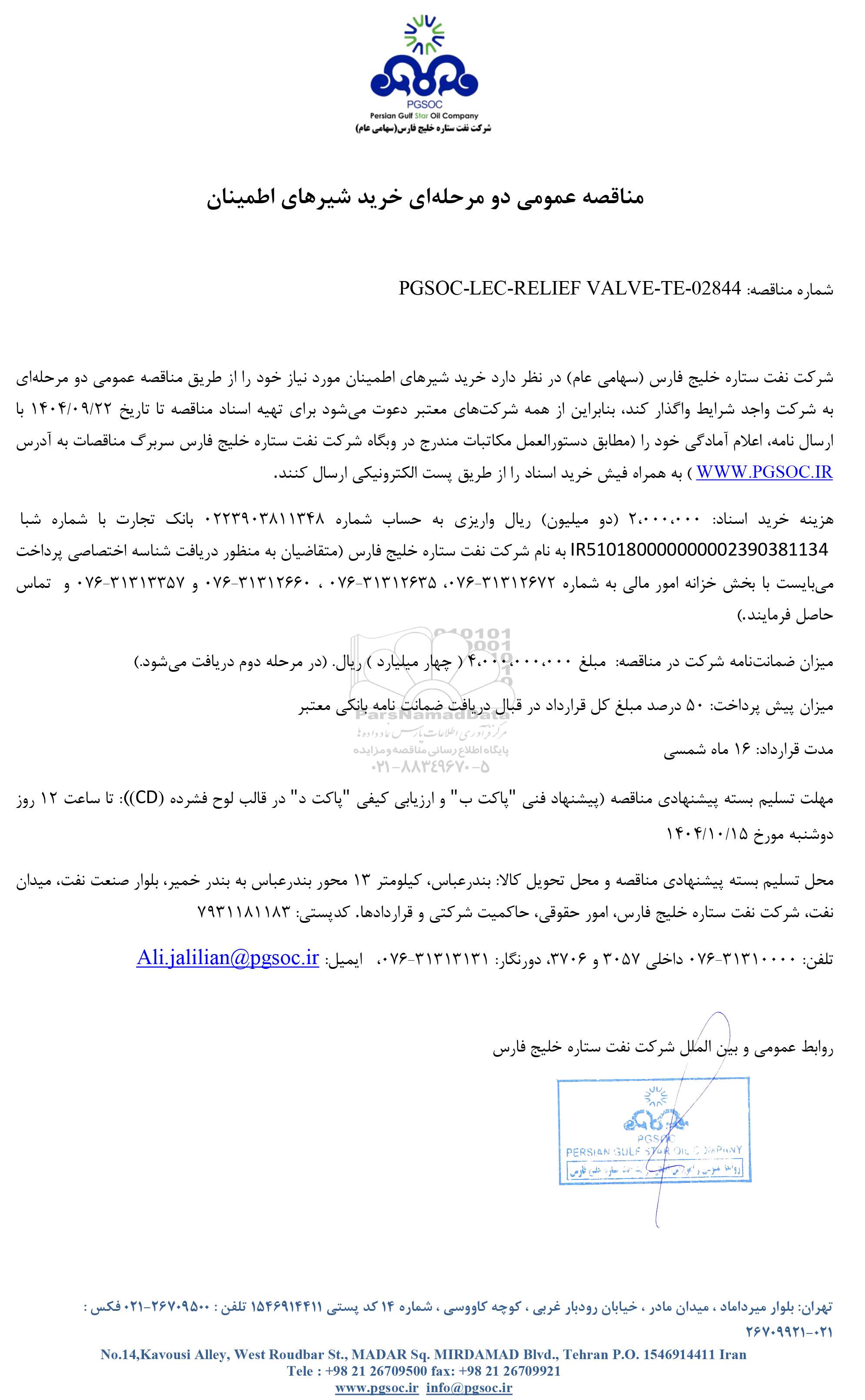 شرکت نفت ستاره خلیج فارس (سهامی عام) در نظر دارد خرید شیرهای اطمینان مورد نیاز خود را از طریق مناقصه عمومی دو مرحله ای به شرکت واجد شرایط واگذار کند، بنابراین از همه شرکت های معتبر دعوت می شود برای تهیه اسناد مناقصه تا تاریخ 1404.09.22 با ارسال نامه، اعلام آمادگی خود را (مطابق دستورالعمل مکاتبات مندرج در وبگاه شرکت نفت ستاره خلیج فارس سربرگ مناقصات به آدرس WWW.PGSOC.IR ) به همراه فیش خرید اسناد را از طریق پست الکترونیکی ارسال کنند.