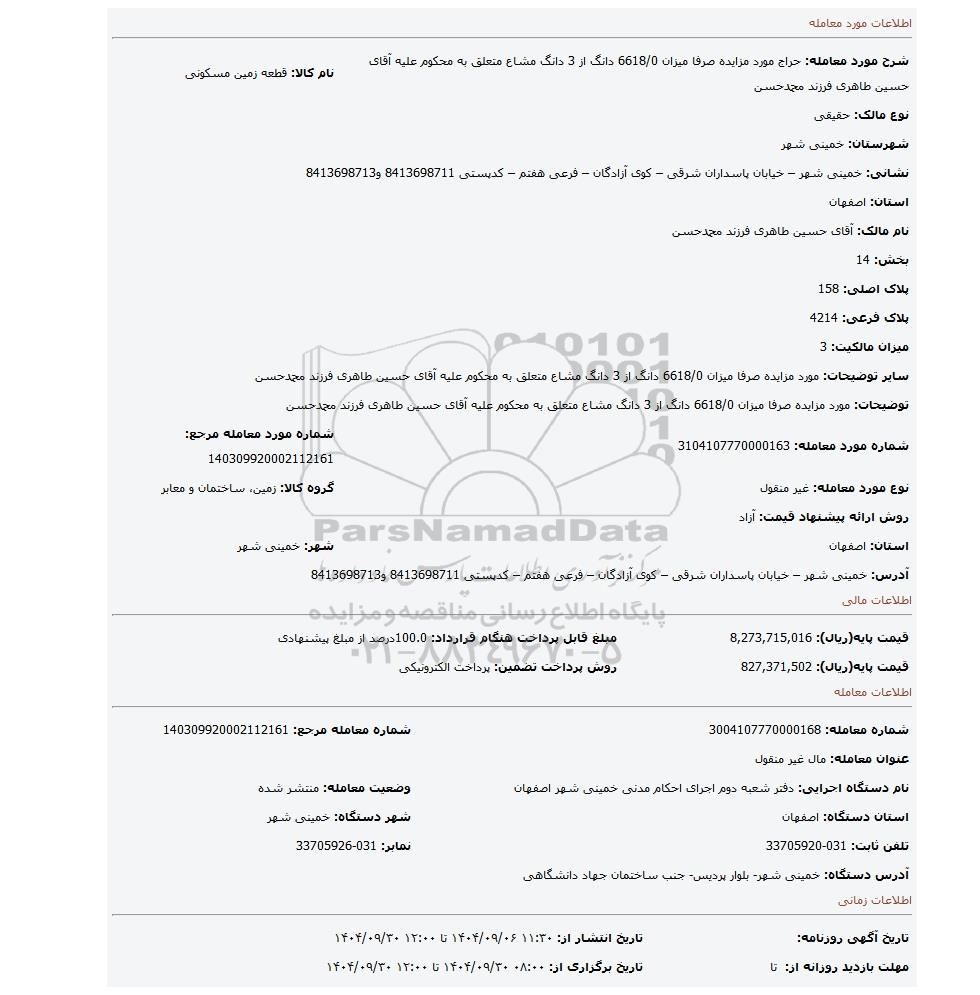 مزایده عمومی مزایده مورد مزایده صرفا میزان 6618/0 دانگ از 3 دانگ مشاع متعلق به محکوم علیه آقای حسین طاهری فرزند محمدحسن برگزار میگردد. از کلیه افراد متخصص و شرکتهای واجد شرایط دعوت به عمل میآید تا در این مزایده با کد خبرگزاری پارس نماد : 9910335 شرکت نمایند تاریخ شروع مزایده : 1404/09/06 مهلت شرکت در مزایده: تا پایان روز 1404/09/30 مکان برگزاری اموال واگذاری استانهای مزایدات استان اصفهان و دستهبندیهای مربوط به این حراجی املاک و زمین میباشد.
