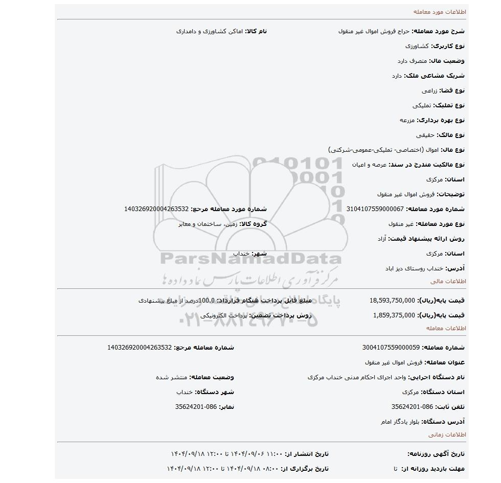 | شرح مورد معامله: حراج فروش اموال غیر منقول | نام کالا: اماکن کشاورزی و دامداری | |