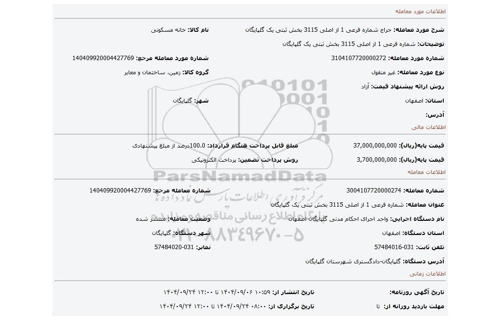 | عنوان معامله: شماره فرعی 1 از اصلی 3115 بخش ثبتی یک گلپایگان | ||