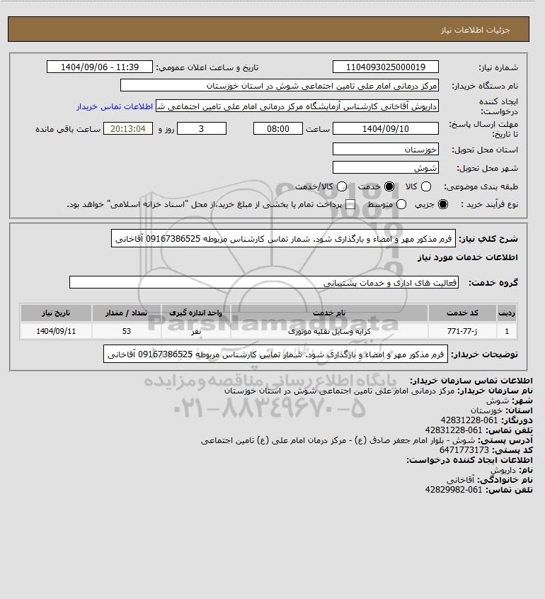 نام دستگاه خریدار:مرکز درمانی امام علی تامین اجتماعی شوش در استان خوزستان