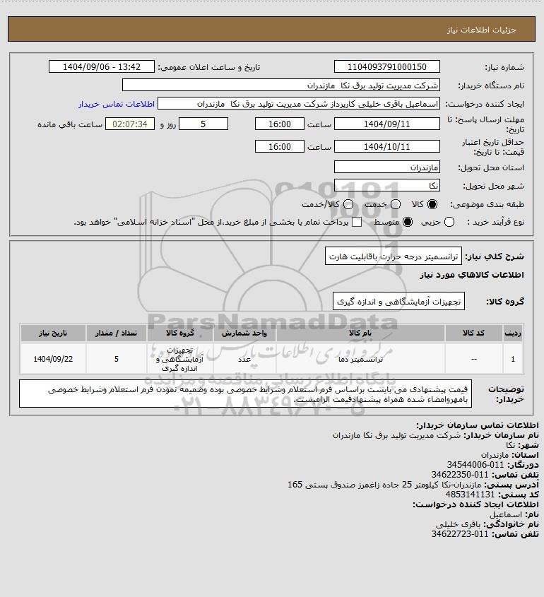نام دستگاه خریدار:شرکت مدیریت تولید برق نکا مازندران
