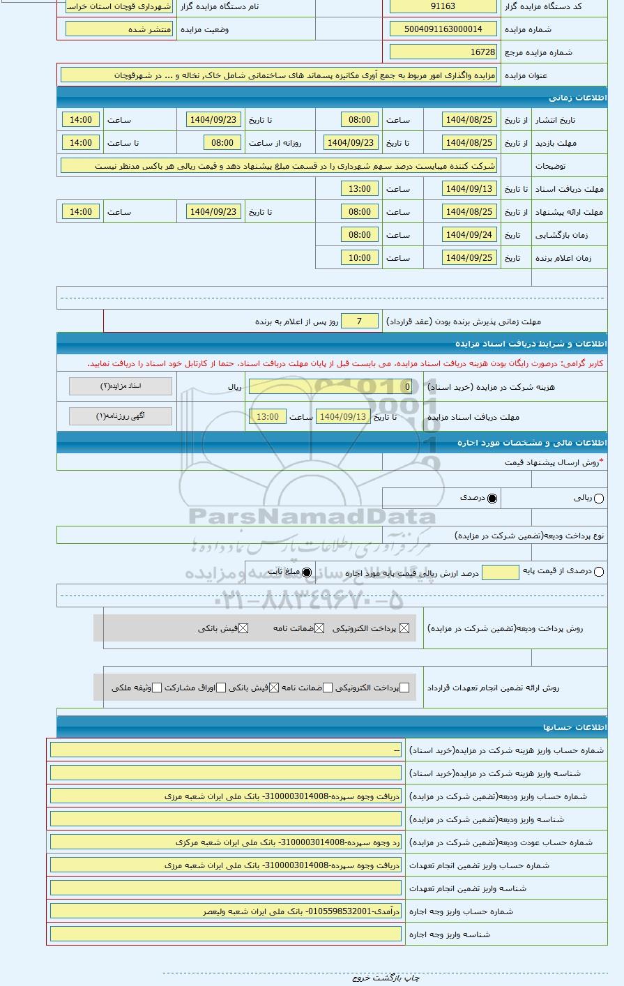 کد مزایده گزار91163نام دستگاه مزایده گزارشهرداری قوچان استان خراسان رضوی