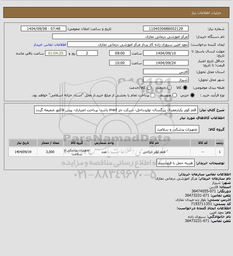 شرح کلی نیاز: قلم کوتر یکبارمصرف بزرگسال- تولیدداخل- شرکت جز imed باشد- پرداخت اعتباری- پیش فاکتور ضمیمه گردد